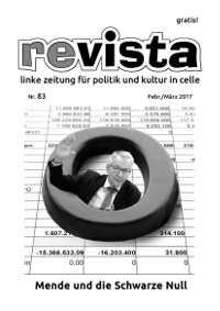 heruntergeladen werden. Bei der Titelstory geht es um den städtischen Haushaltsentwurf für 2017. Daneben finden sich verschiedene andere kommunalpolitische Artikel, z.B. zu "Flüchtlingen in Celle", zum "Fahrradfreundlichen Umbau von Kreuzungen", wieder mal zu "Rheinmetall" und und und. Im Kulturteil gibt's u.a. eine Einführung in die "Barbie"-Ausstellung, ein Interview mit Stefan Eichardt vom Kino achteinhalb und eine ausführliche Besprechung des Buches von Halil Savucu über "Yeziden in Deutschland".