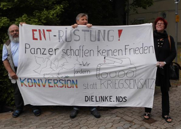DIE LINKE. Niedersachsen protestierte am 24.06. zusammen mit dem Friedensbüro Hannover und der Gruppe "Land in Sicht - Transition / Celle" (LIST) anlässlich der Schlüsselübergabe des Schützenpanzers Puma an die Bundeswehr gegen Aufrüstung und Krieg. Die Protestkundgebung fand statt vor dem Haupteingangstor der Firma Rheinmetall Landsysteme.